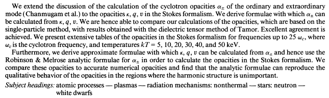 | Title: | Thermal Cyclotron Absorption Coefficients. II. Opacities in the Stokes Formalism | |