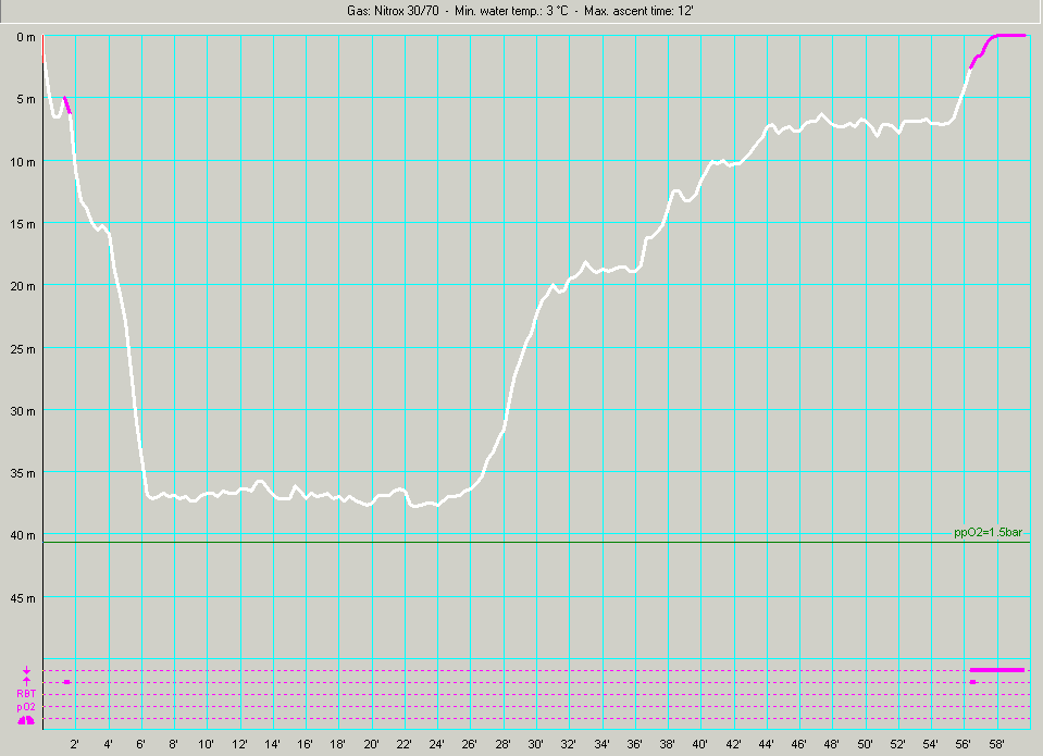 | March 2003 | We had chartered a boat in order to dive to the Jura. Thereby I made my first trimix dive. Hans Drexler was my diving buddy. This dive was made with a 21/35 mix for the bottom gas and a 50% nitrox as deco gas. The dive plan was created with the V-planner. The dive itself was read from an Aladin dive computer. The computer was set to 30% nitrox, but of course we did not dive according to the computer. The computer was only used for obtaining depth and time. |